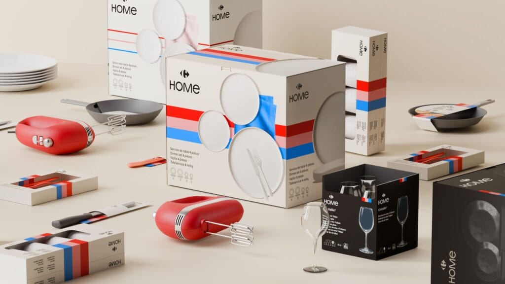 A nova identidade da Carrefour Home chega a diversos canais e mercados. O projeto inclui materiais de PDV, embalagens em papelão 100% reciclável e campanhas digitais.